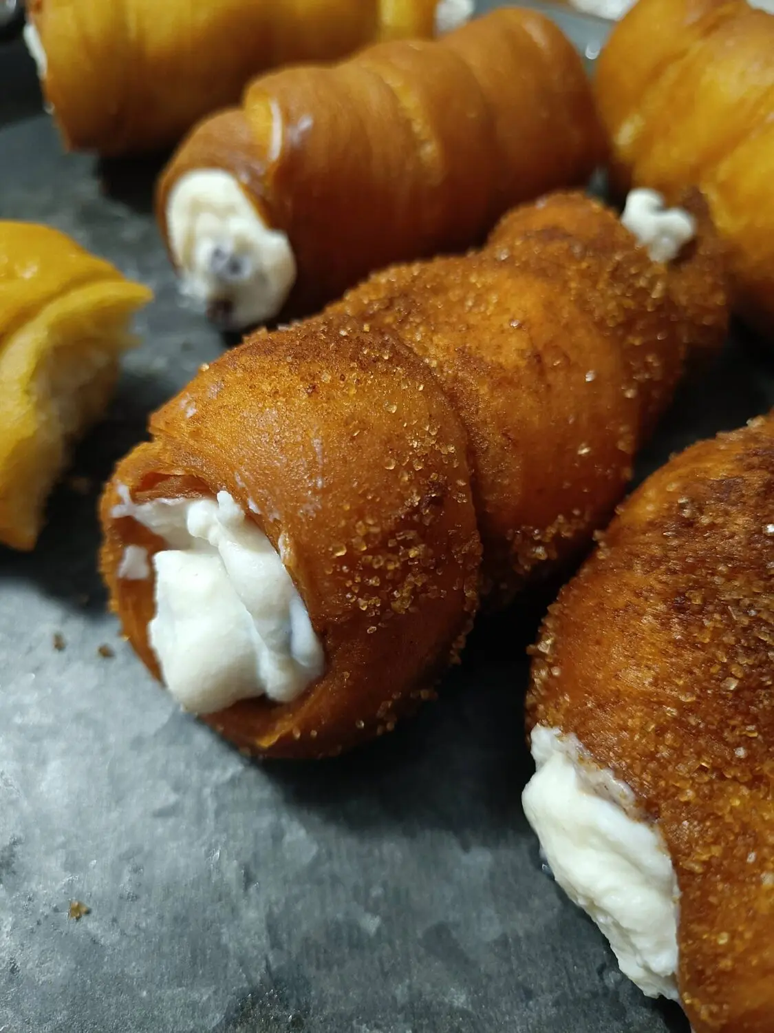 Rövid pihentetés után kukacokat sodrok belőlük, kézzel beolajozom a habroló formákat (nálam canolli, de mindegyik roló forma jó, 8 cm hosszú), enyhén megszórom liszttel, és háromszor körbetekerem a habroló formákon – pici hézagokat hagyva csak. Figyelek, hogy a szélek szabadon maradjanak valamelyest, mert kelés és sütés közben is terjeszkedni fog még a tészta.